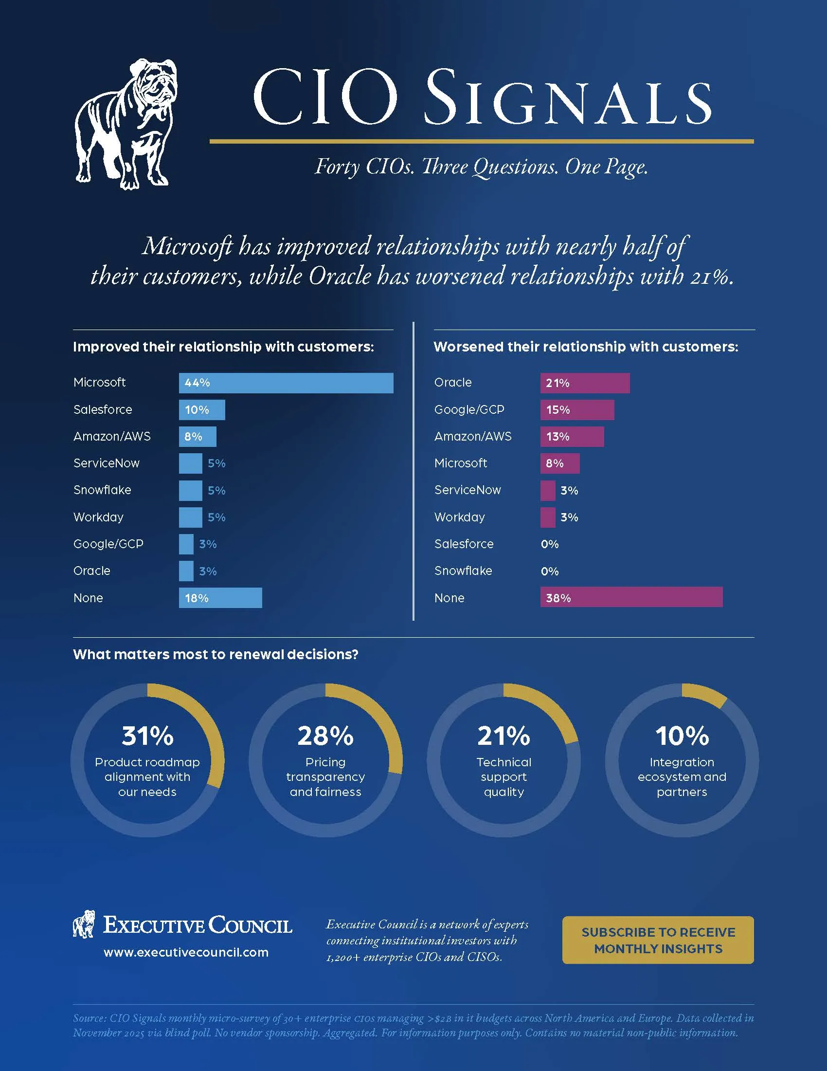CIO Signals delivers monthly vendor sentiment data from 40 enterprise CIOs. No vendor sponsorship. Aggregated and anonymized. Published the first week of each month
